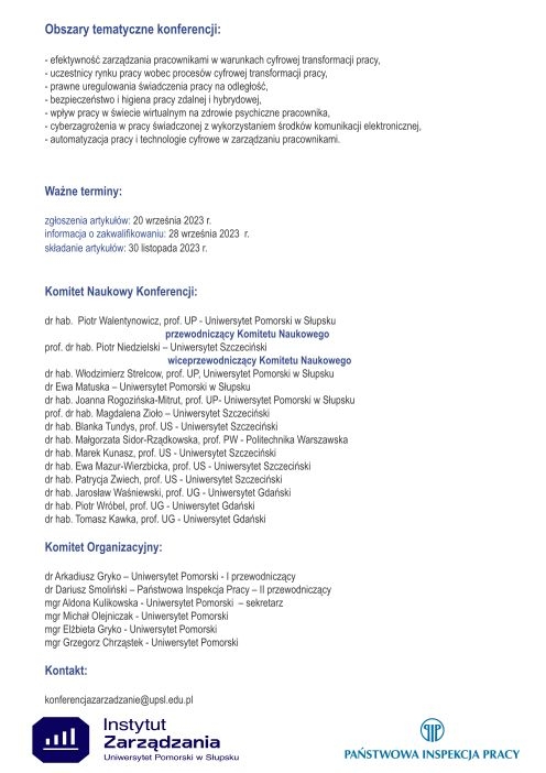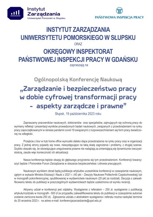Uniwersytet Pomorski w Słupsku - Zarządzanie i bezpieczeństwo pracy w dobie cyfrowej transformacji pracy - aspekty zarządcze i prawne. 19 października 2023